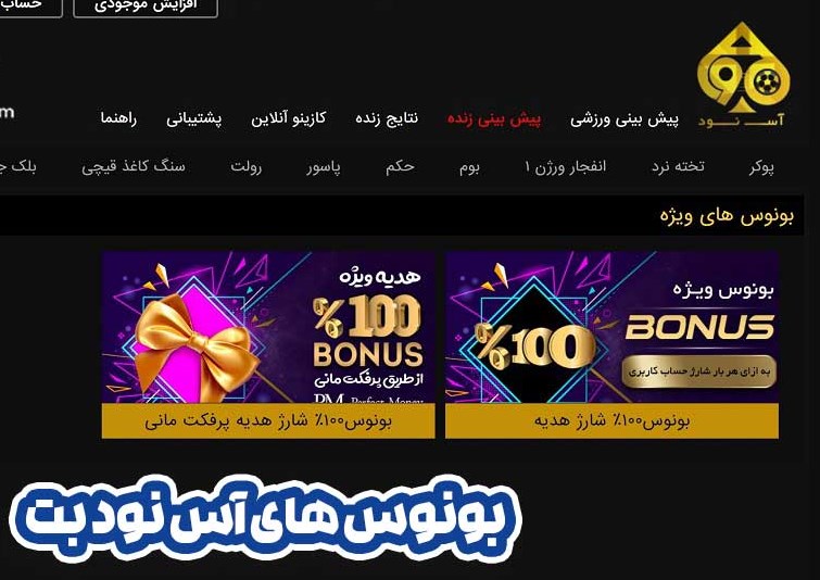 آس نود بت از سایت های دیرباز ایرانی در عرصه بتینگ ها همان شرط بندی بوده است این سایت کاملا دارای امنیت بالایی است و می توانید بدون محدودیت و دشواری در سایت آس 90 شرط بندی کنید. این سایت با ارائه بهترین امکانات ، بونوس ها ، بازی های کازینو و … توانسته در بهترین سایت های شرط بندی قرار گیرد. برای ورود و شرط بندی در این سایت از دکمه های موجود در این صفحه استفاده کنید.