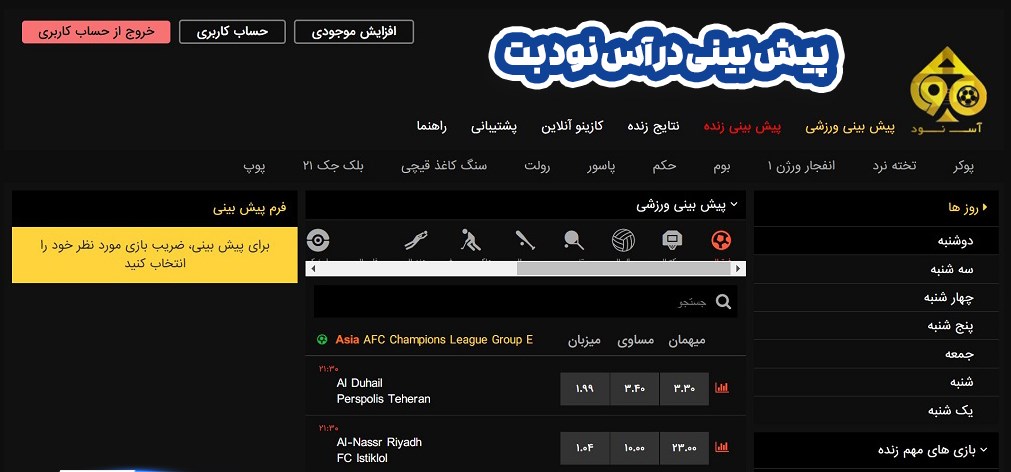 در هر دو بخش پیش بینی ورزشی و زنده، رابط کاربری ساده و دسته بندی منظم مسابقات باعث می شود کاربران به راحتی بازی مورد نظر خود را پیدا کنند. همچنین امکان مشاهده تاریخچه شرط ها، مدیریت مبالغ و بررسی شرط های فعال نیز فراهم شده است. در مجموع، بخش پیش بینی سایت آس نود بت با تنوع بالای بازی ها و گزینه های شرط بندی، تجربه ای کامل و هیجان انگیز را برای کاربران فراهم می کند.