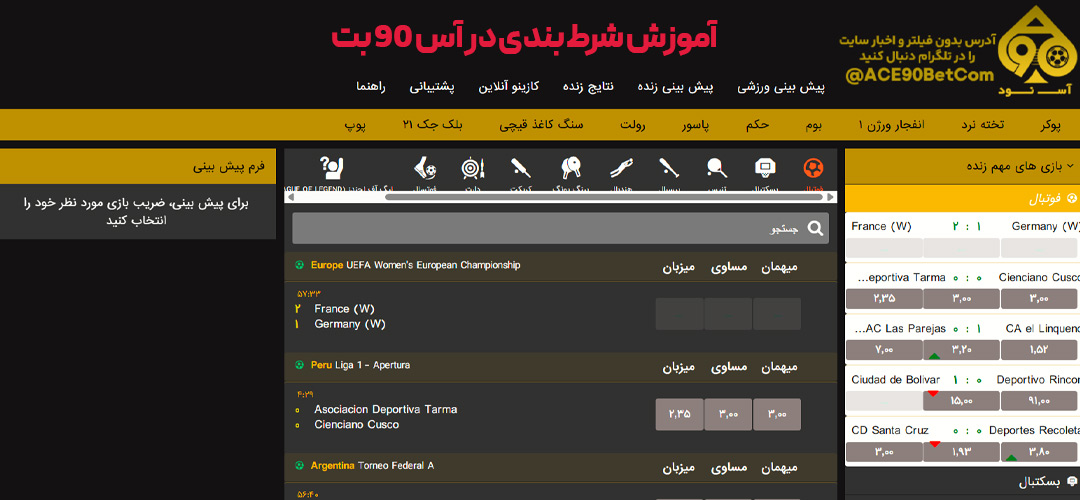 سایت شرط بندی آس نود بت Ace90Bet یکی از محبوب ترین پلتفرم های شرط بندی آنلاین است که امکان پیش بینی مسابقات را در دو بخش پیش بینی ورزشی و پیش بینی زنده برای کاربران خود فراهم کرده است. این تنوع باعث می شود کاربران بتوانند هم قبل از شروع مسابقات و هم در حین برگزاری بازی ها، شرط های متنوع و هیجان انگیزی ثبت کنند. برای ورود به بخش پیش بینی آس نود بت کافی است از منوی بالای سایت، یکی از گزینه های پیش بینی ورزشی یا پیش بینی زنده را انتخاب کرده و وارد لیست کامل مسابقات شوید.
