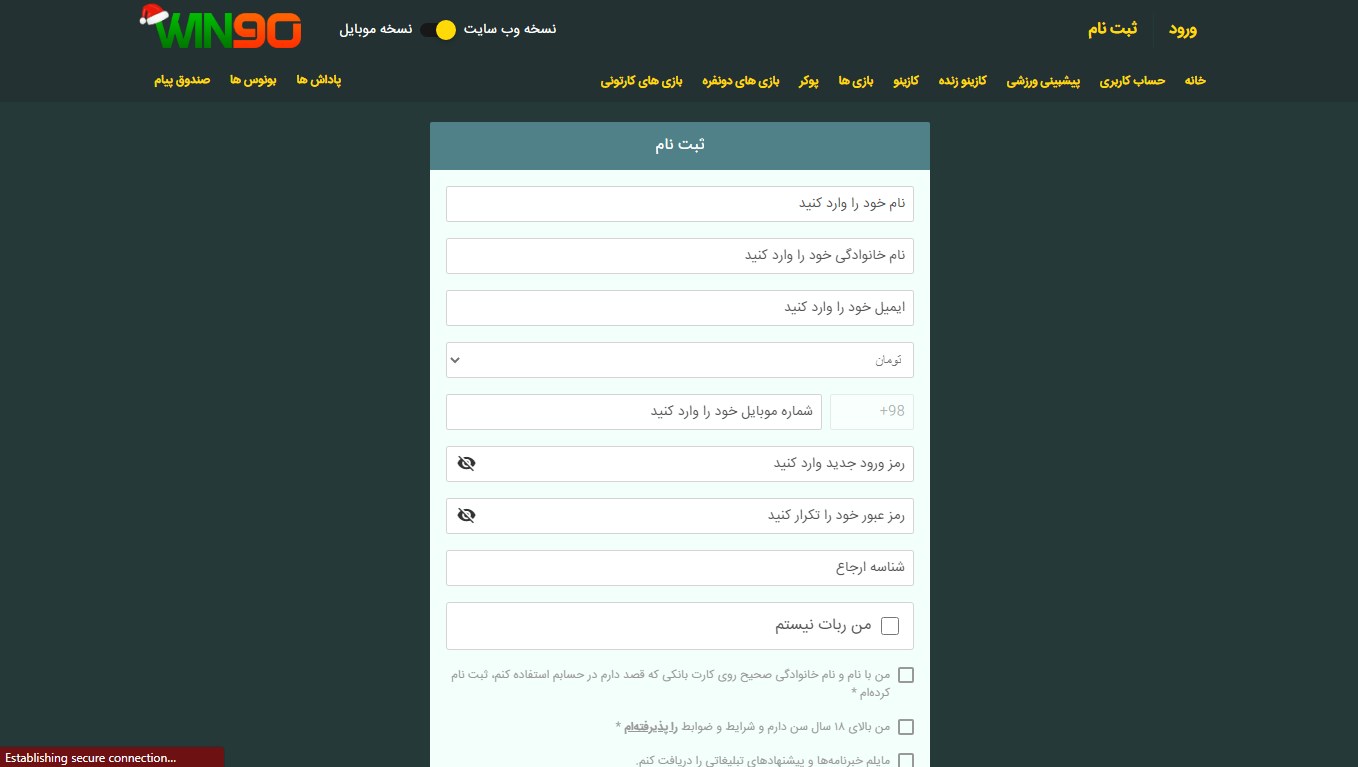 تایید قوانین سایت: نشان می دهد کاربر شرایط و قوانین Win90 را پذیرفته است و بدون آن ثبت نام کامل نمی شود.